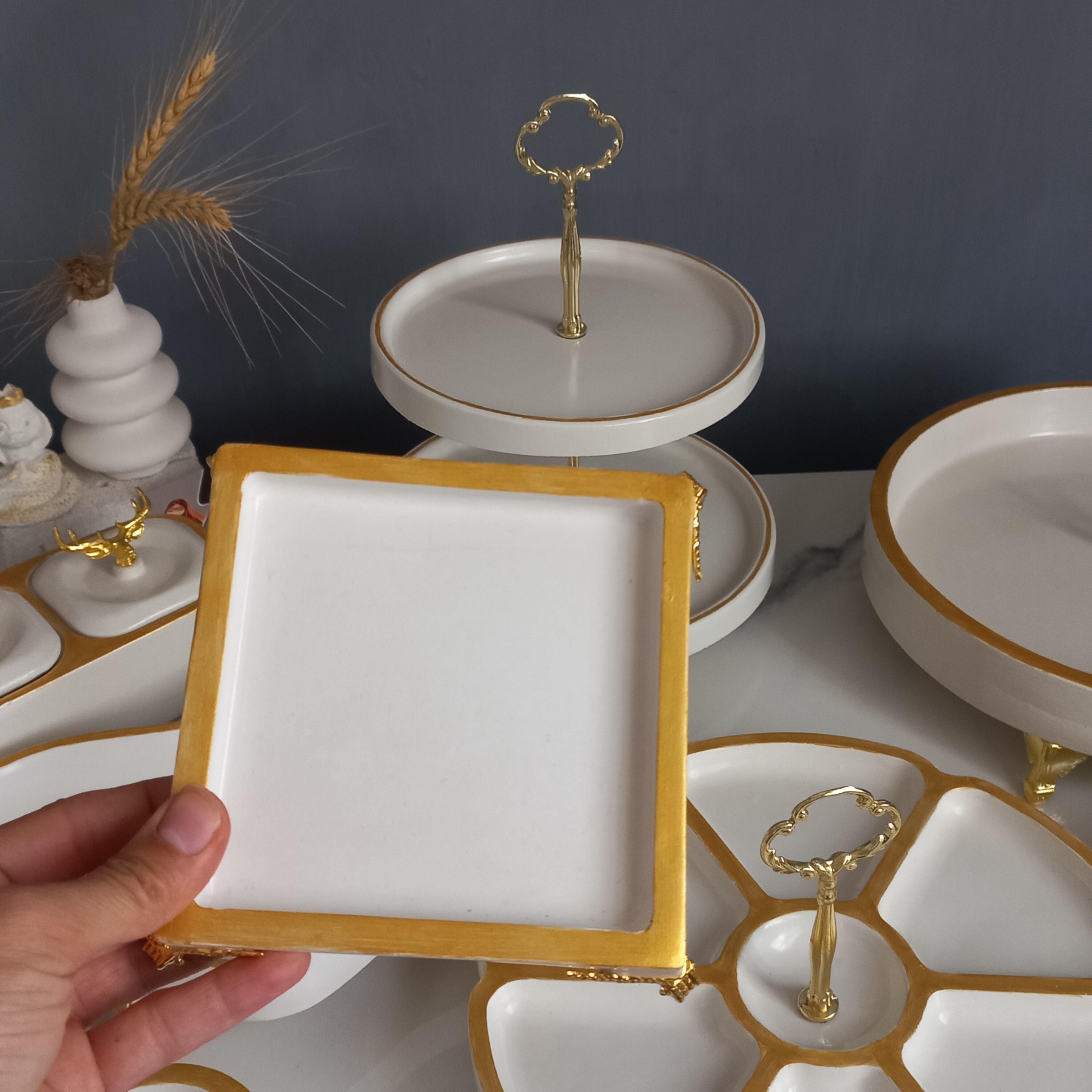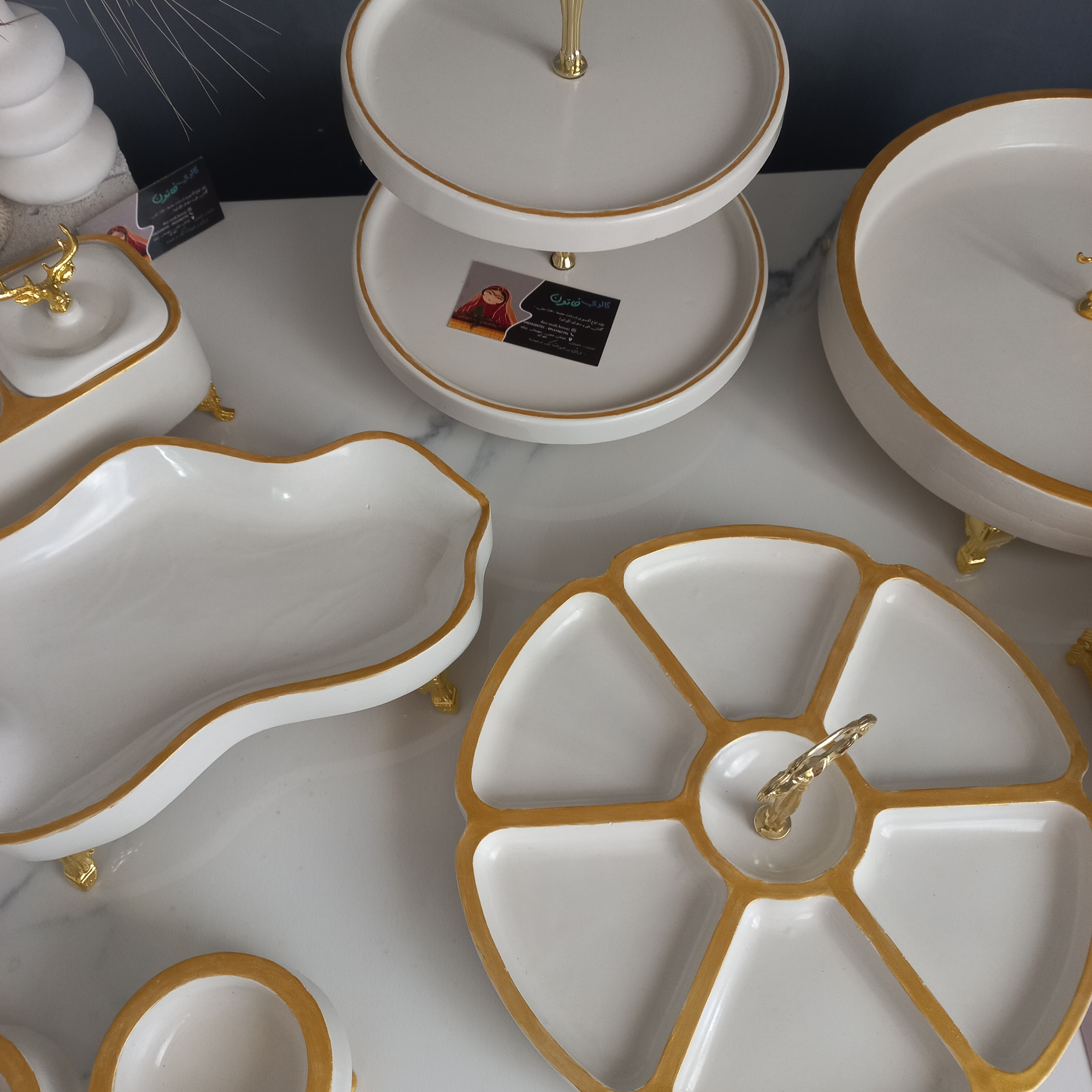 سرویس پذیرایی سنگی عروس میوه خوری قطر سی شیرینی خوری دو طبقه آجیل خوری دفرمه آجیل خوری گرد ششتایی ظرف سه قلو مناسب آجیل تخمه شکلات و.. پیشدستی ۶عدد پیاله۲عدد قندان ۱عدد