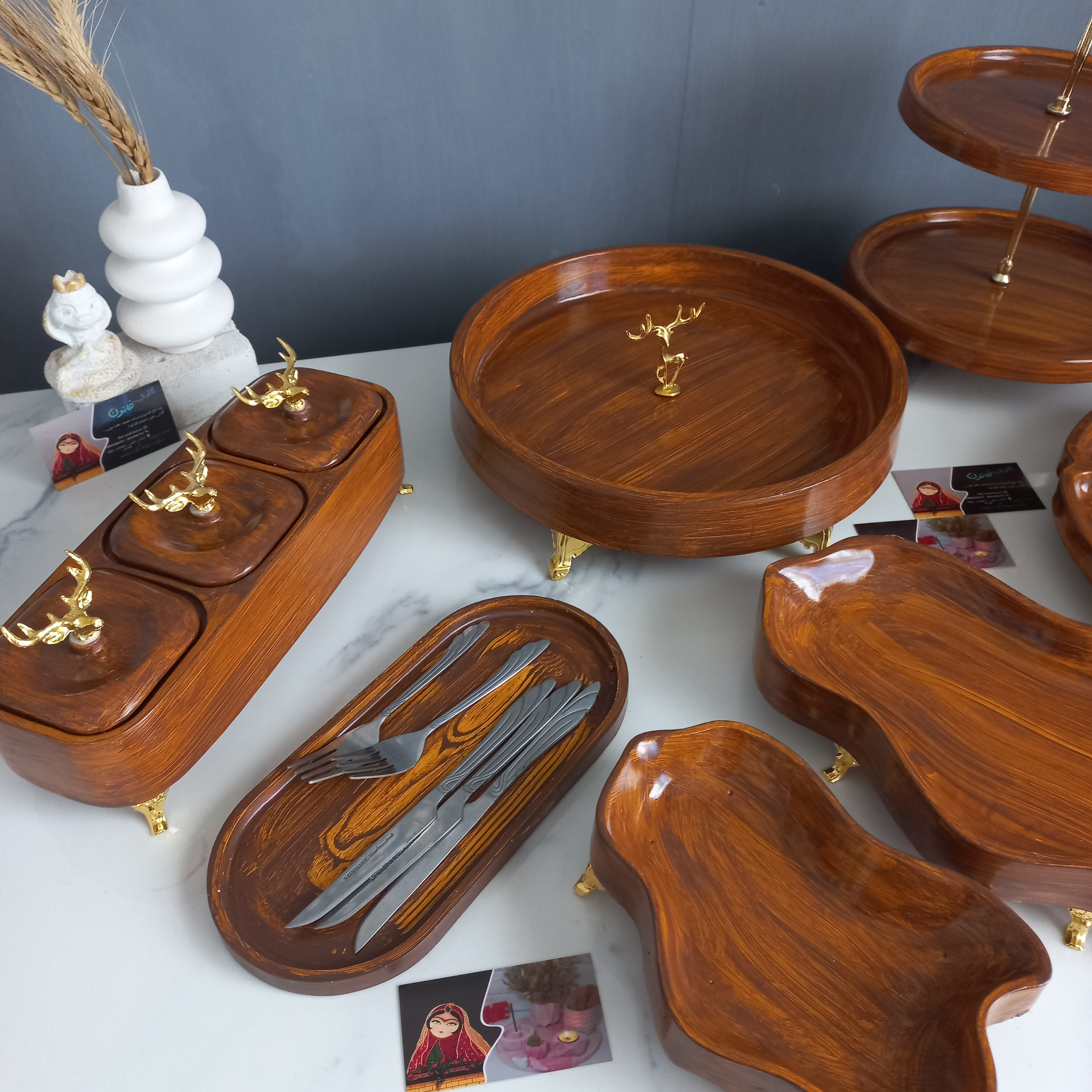 سرویس کامل پذیرایی شامل👇👇 شیرینی خوری دو طبقه میوه خوری قطر سی ظرف سه قلو مناسب(قند.اجیل.تخمه نخود و.. آجیل خوری گرد شش تیکه شکلات خوری دفرمه آجیل خوری دفرمه سینی قاشق چنگال۸تیکه طرح چوب