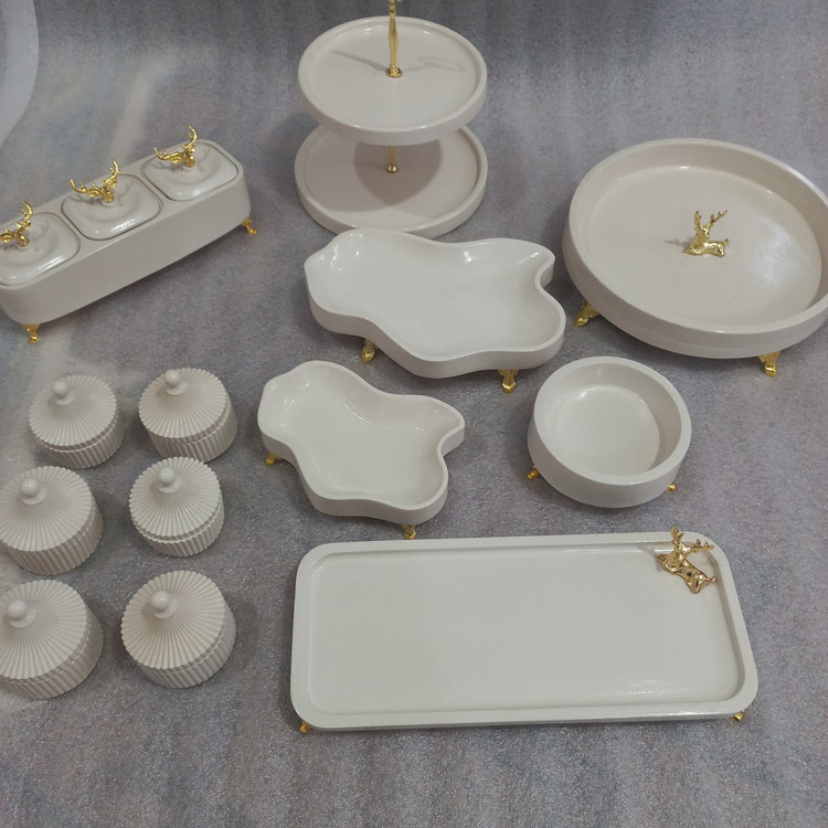 شامل :میوه خوری قطر سی.شیرینی خوری دو طبقه.اجیل خوری گرد شش خانه.شکلات خوری دفرمه.اجیل خوری سه قلو.سینی مناسب کارد چنگال.سینی مناسب شیرینی. چای. قندان ۶عدد