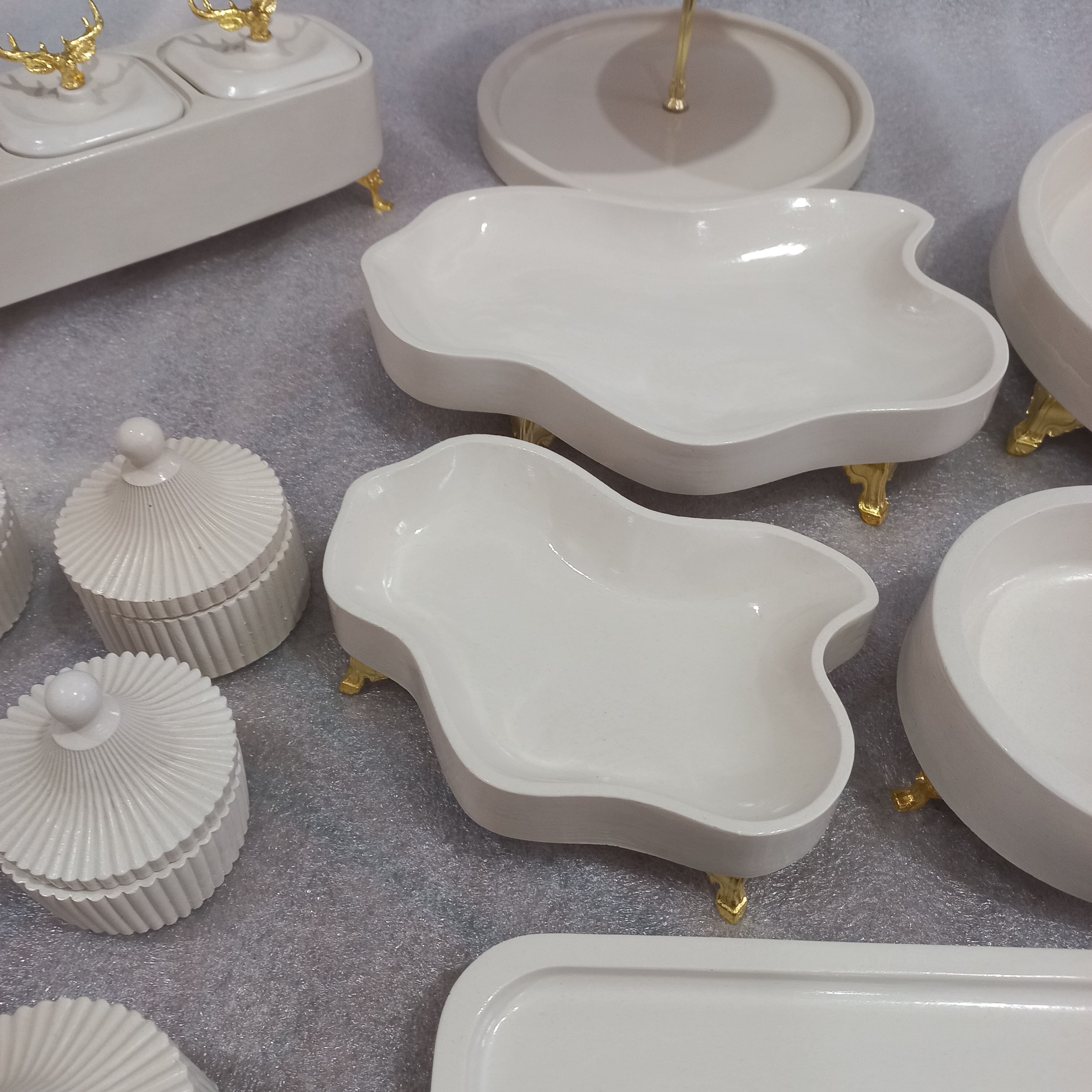 شامل :میوه خوری قطر سی.شیرینی خوری دو طبقه.اجیل خوری گرد شش خانه.شکلات خوری دفرمه.اجیل خوری سه قلو.سینی مناسب کارد چنگال.سینی مناسب شیرینی. چای. قندان ۶عدد